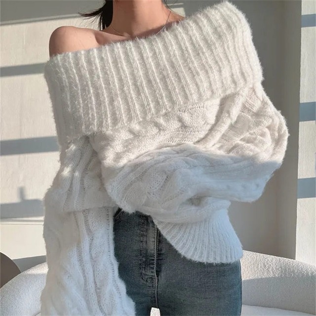 オフショルケーブル編みニットトップス